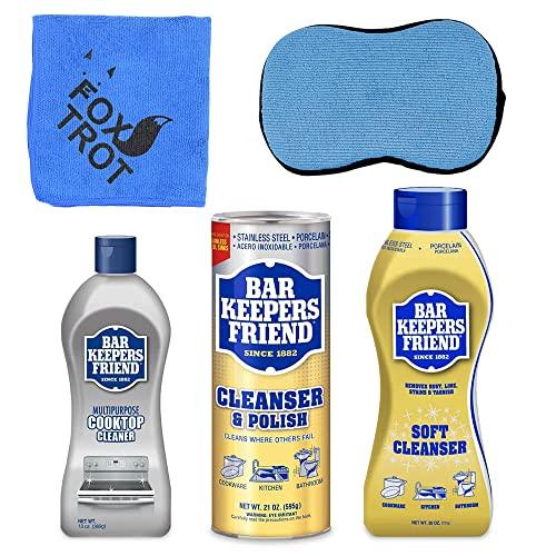 BAR KEEPERS FRIEND Cleanser Trio - Mega Bundle (21 Oz Cleanser and Polish Powder | 26 Oz Liquid Soft Cleanser | 13 Oz Cooktop Cleaner) Plus 1 Foxtrot Microfiber Towel and 1 Microfiber Scrubber Sponge