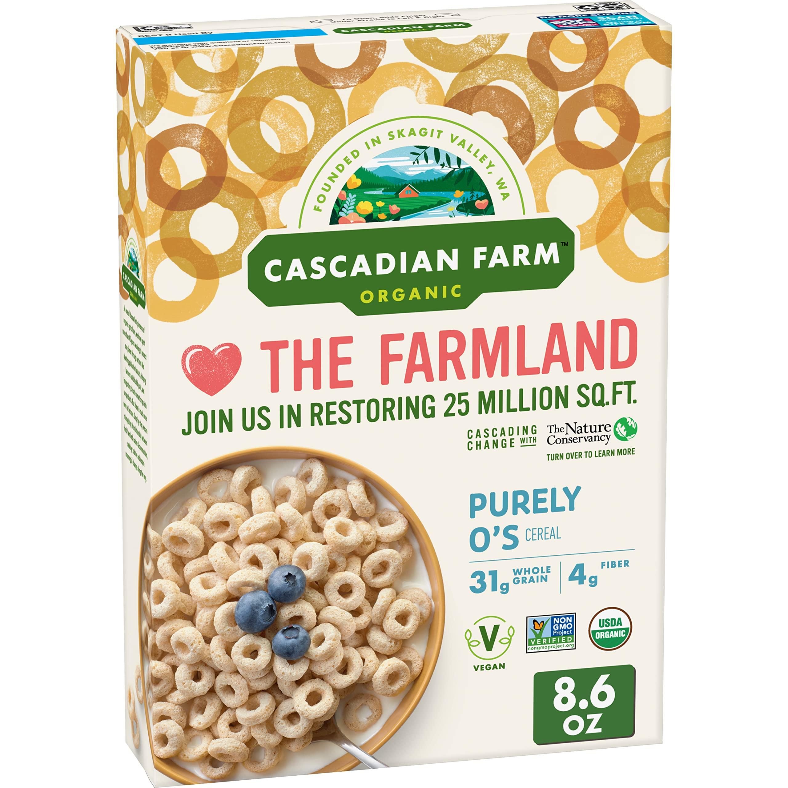 Cascadian Farm Organic Purely O's Cereal features O-shaped cereal pieces made with whole-grain oats and barley. Enjoy this tasty organic cereal with milk, sprinkle on top of oatmeal, your favorite yogurt or ice cream, or enjoy by the handful as a crunchy, on-the-go snack. With 31 grams of whole grain* and 4 grams of fiber per serving, it's a delicious addition to your day. This tasty breakfast cereal will be a hit for the whole family. *31g whole grain per serving. At least 48g recommended daily. Always Organic. Never Ordinary. Thats been our mantra since 1972. Since then, weve remained a producer of organic cereals, fruits, vegetables, granola and snack bars. Cascadian Farm is a pioneering supporter of farmers who use practices that regenerate the land and their communities.
