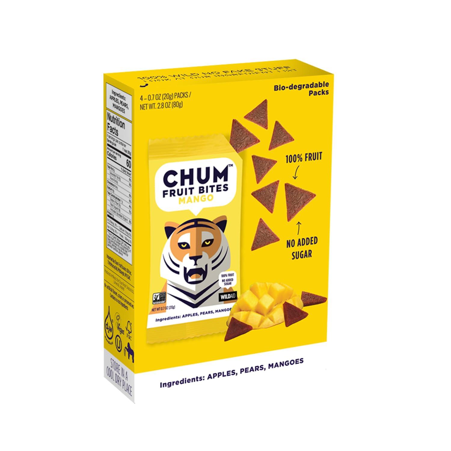 - CHUM BITES ARE MADE WITH 100% FRUIT Chum Bites are soft triangle snacks made with whole fruits and nothing else. Chum Bites also have no added sugar, colorants, preservatives, gumming agents, or stabilizers. Try our fruit bites in a variety of flavors: Apple, Blackberry, Mango, Peach, and Strawberry.