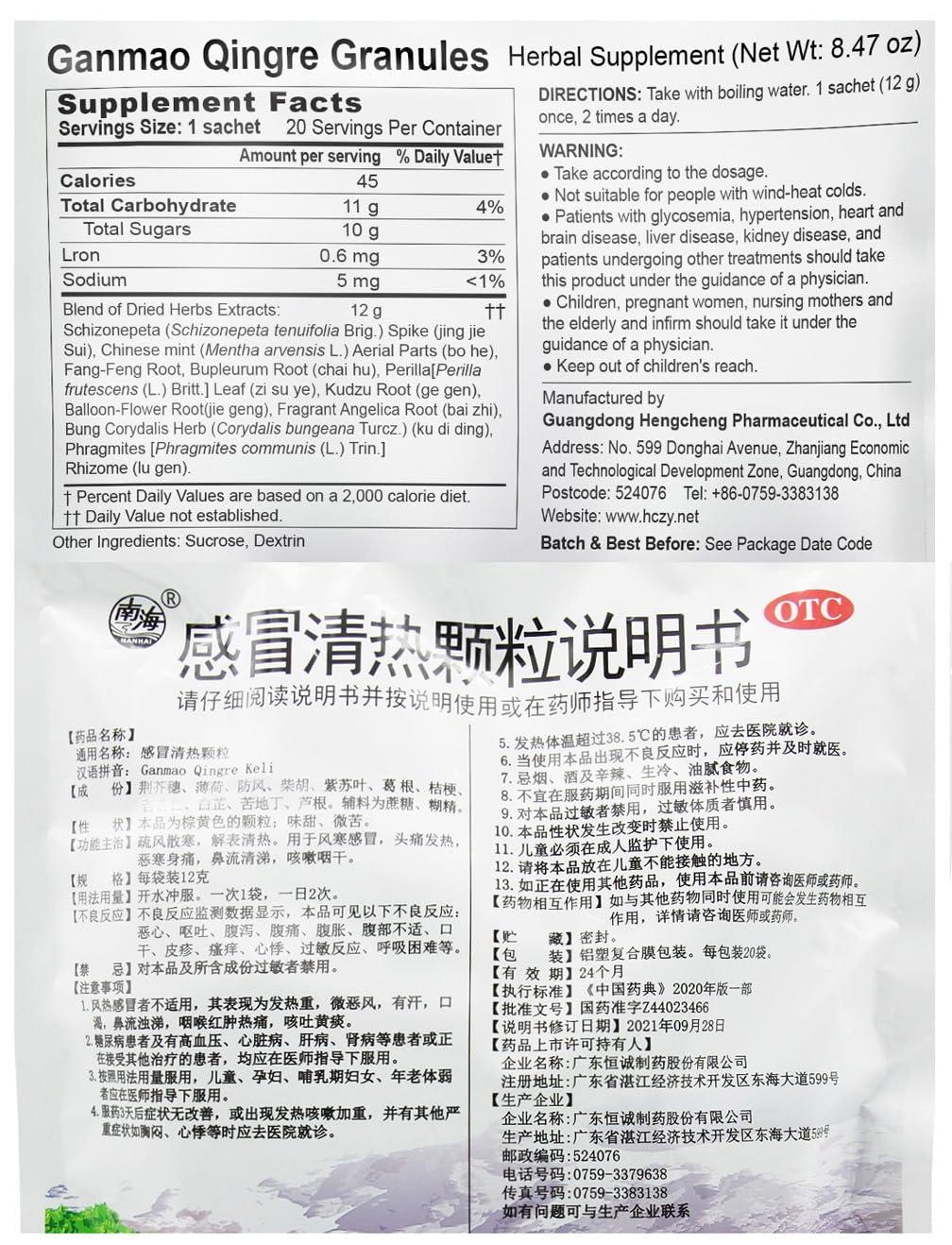 Ganmao Qingre Granules can support the health of the gastrointestinal tract, as well as the immune and upper respiratory systems. Its proprietary herbal blend ingredients, such as Bupleurum Root, Fang Feng Root, Schizonepeta Spike, etc., bring many benefits to our overall physical health: * Bupleurum Root (Chai Hu) This ingredient is known to provide help to your immune system. It helps your body's natural ability to respond to stresses while supporting the upper respiratory system.* Fang-Feng Root (Fang-Feng) Known to support the body's natural ability to resist external stresses. Fang-Feng helps a healthy circulatory system process toxins while also supporting normal bowel and intestine function.* Schizonepeta Spike (Jing Jie Sui) Jing Jie Sui is known to naturally support healthy circulatory and nervous systems. It also helps a healthy immune system.* Gan Mao Qing Re Granules is very popular in China and is often used to resist wind-cold.* Directions: Take with boiling water. 1 sachet at a time, 2 times a day.