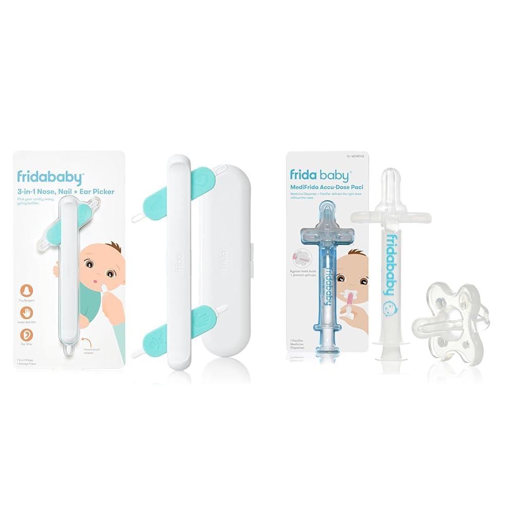 The ultimate booger busting team brings you our 3-in-1 Picker. It's as grossly satisfying as sucking snot, but perfectly designed to clean crusties + gunk out of all bodily crevices. The FridaBaby MediFrida delivers baby the full dose of medicine without the spit up. The soft, familiar paci sends medicine to the side of the cheek and bypasses baby's taste buds to prevent spit-ups and allows baby to swallow the doctor's recommended dose. The MediFrida medicine pacifier is the only paci-style baby medicine dispenser that doubles as a real pacifier, so dosing doesn't disrupt baby's busy soothing schedule.
