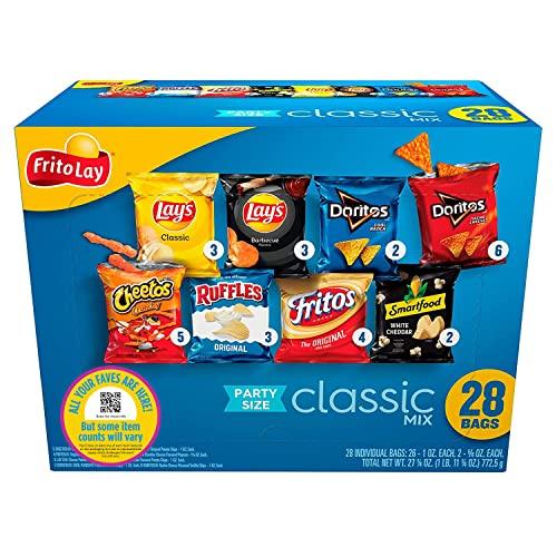 - 28 Count Mix Includes: Lay's Classic Potato Chips, Lay's Barbecue Flavored Potato Chips, Doritos Cool Ranch Tortilla Chips, Doritos Nacho Cheese Potato Chips, Cheetos Crunchy, Ruffles Potato Chips, Fritos Original, & Smartfood White Cheddar Flavored Popcorn