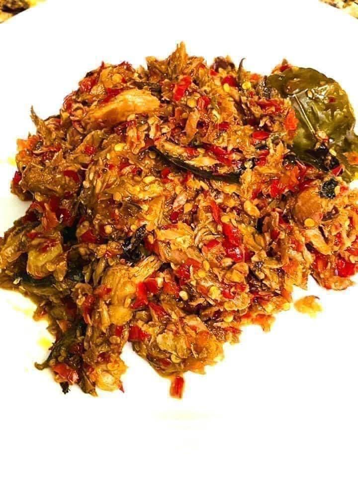 delicious Cakalang Fish cooked with chili and Spices Manados style. Product of Indonesia. Halal Certified.