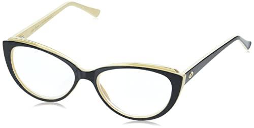 Glossy black plastic with contrasting bisque interior is accented by gleaming goldtone metal brow accents in these Art Deco-inspired Sofia Vergara x Foster Grant women's reading glasses. The 1920s-worthy cat-eye frame has a cool two-tone look, while scratch- and impact-resistant full magnification clear lenses provide maximum clarity and UV protection when exposed to sunlight. A leopard print hard shell case with logo interior and cleaning cloth will protect your readers in style.