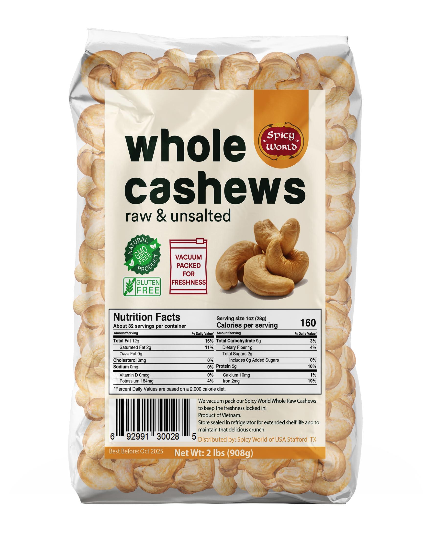 Spicy World Raw Cashews Whole 2 Pound Bulk - Unsalted, Natural & Pure, No Chemicals