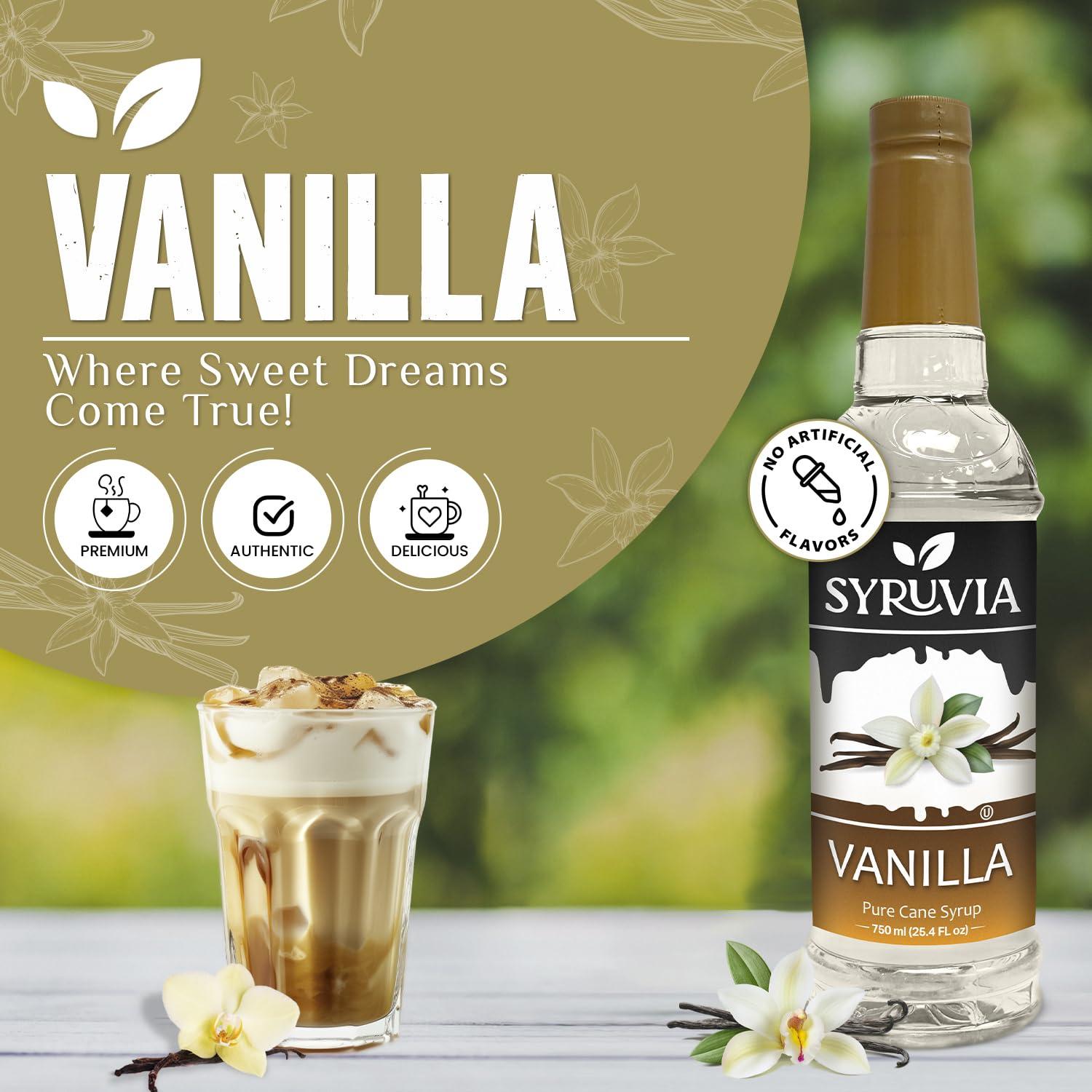 - Vanilla Syrup: Embrace the timeless taste of vanilla with Syruvia's Vanilla Syrup. Let its silky, velvety sweetness create a comforting ambiance in your favorite concoctions.