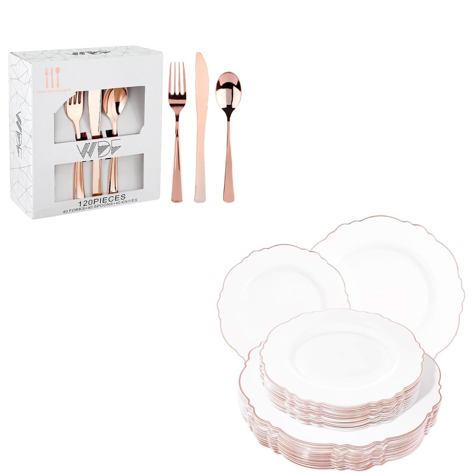 Baroque White &Rose Gold Disposable Plates including 30Plastic Dinner Plates 10.25inch, 30 Salad Plates 7.5inch for Wedding& Parties Heavyweight Plastic Cutlery- Includes 40 Forks, 40 Spoons, 40 Knives for Valentine's Day, Mother's Day,Wedding&Party
