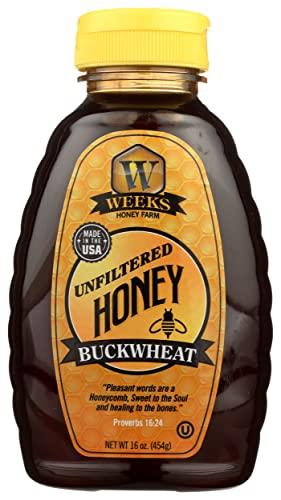 - Weeks Raw American Buckwheat Honey has a dark, distinctive color and strong, full-bodied spicy-molasses flavor. This honey's taste is strong like blackstrap molasses.