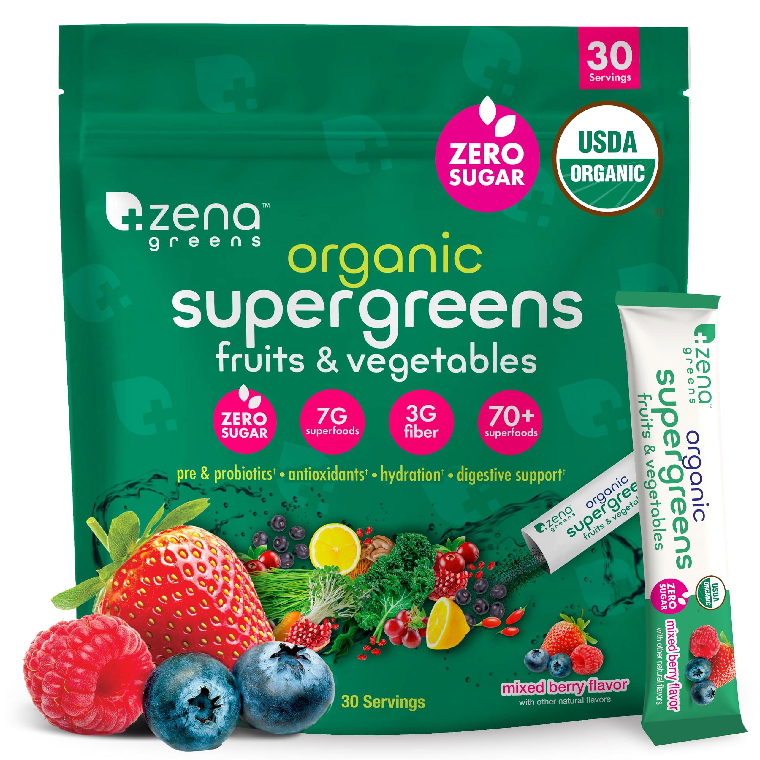 - ORGANIC SUPERGREEN BLEND: Enjoy a powerful boost of nutrition with Zena Greens Organic Super Greens Fruits & Vegetables. Each serving contains 7 grams of superfoods and 3 grams of fiber, featuring over 70+ super ingredients to support overall health and wellness. Packed with an extensive blend of organic greens, fruits, vegetables, herbs, super mushrooms, and essential prebiotics & probiotics with digestive enzymes, this supplement is designed to support your overall wellness and vitality.
